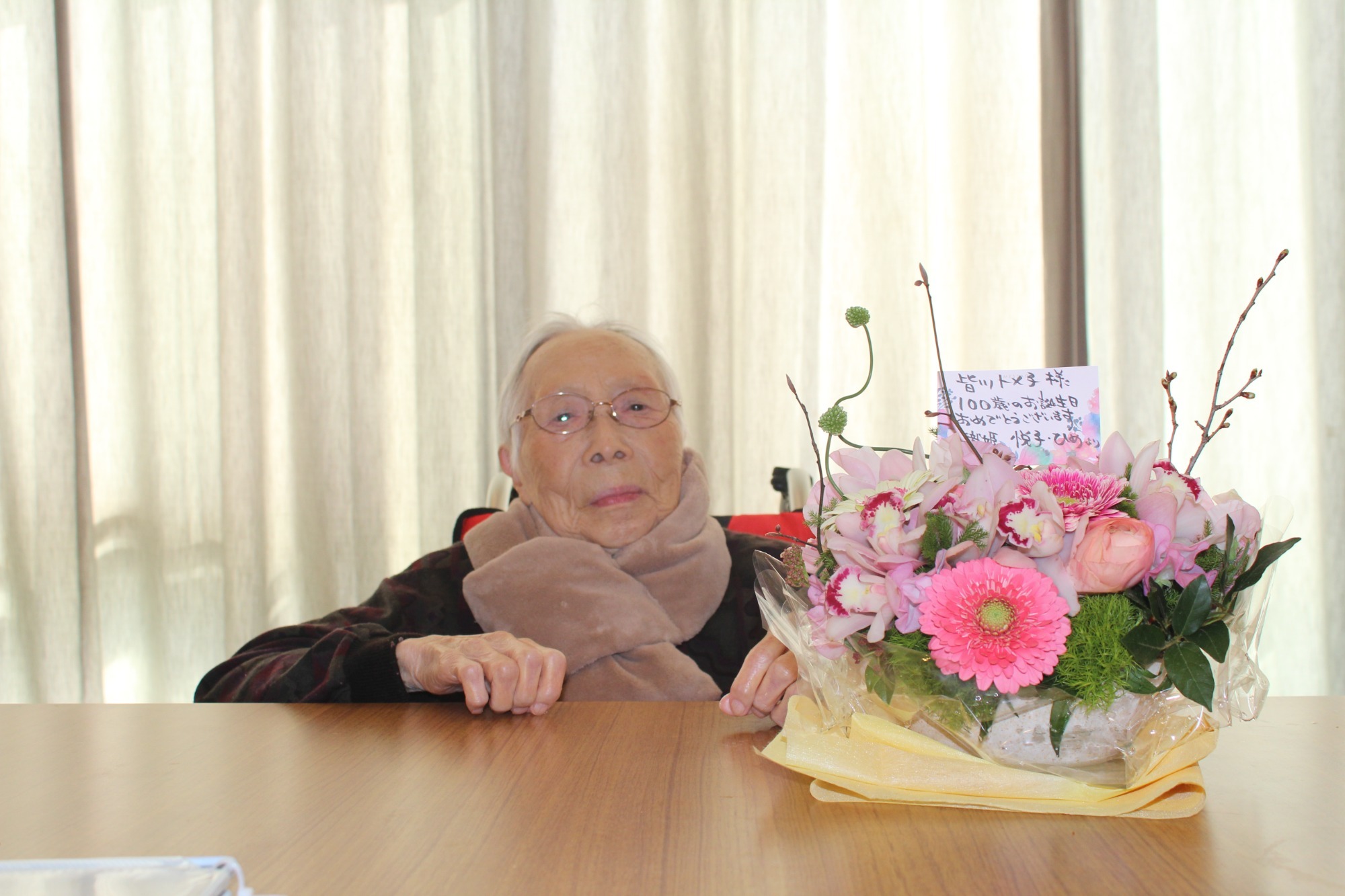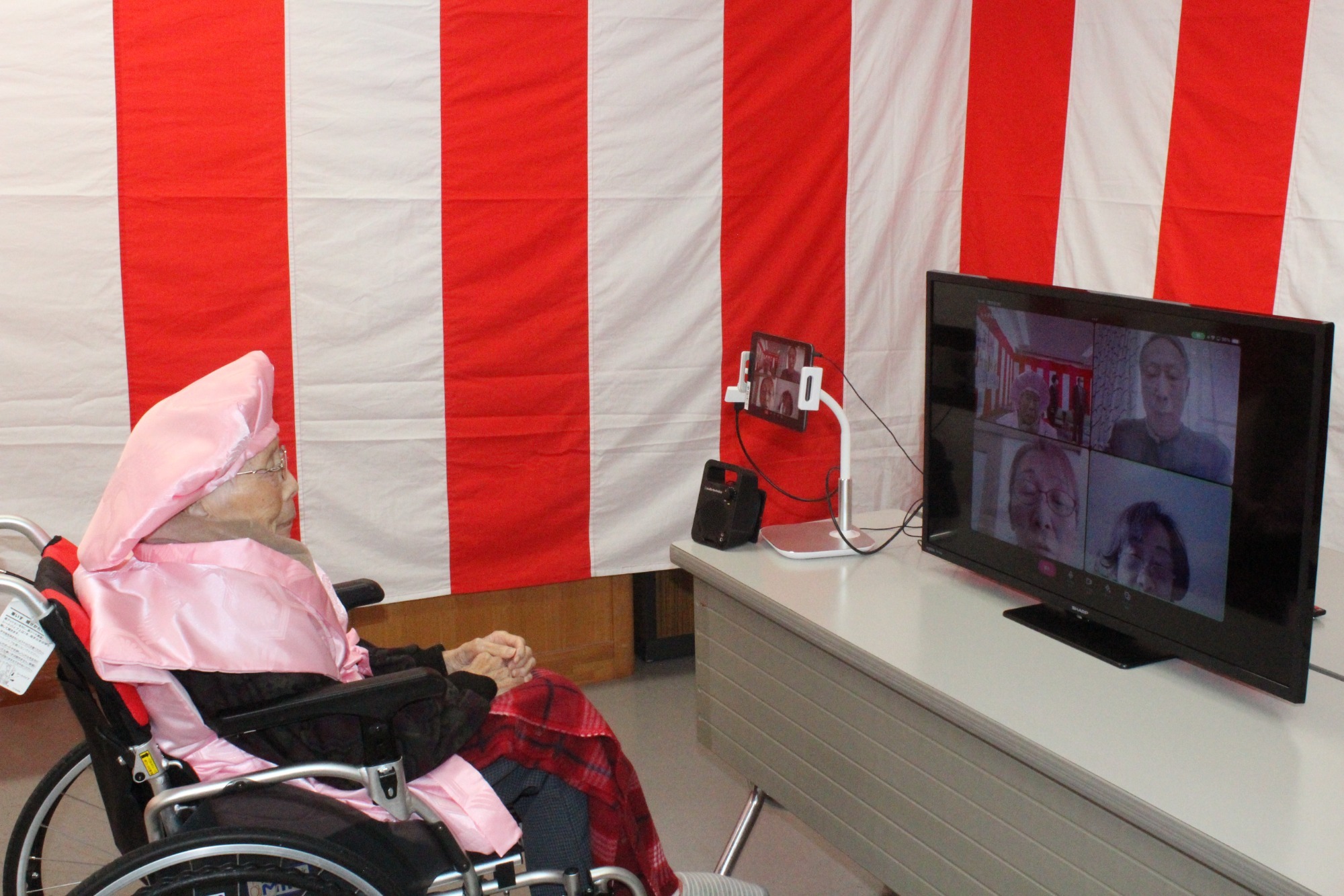 令和8年1月15日に昭和ホームご利用者の皆川トメ子様(大正15年1月4日生)の百歳賀寿贈呈式が執り行われました。ご家族にもオンラインでご参加いただき、昭和村長をはじめ関係機関の長より賀寿、記念品、花束が贈られました。そして何よりも感動されていたのが、舟木村長よりトメ子様ご自身がからむし織りで仕立てた着物が披露された時でした。貴重な品をお持ち頂きありがとうございました。また、トメ子様がご指導された織り姫さん達からフラワーアレンジメントが届き大変喜ばれていました。